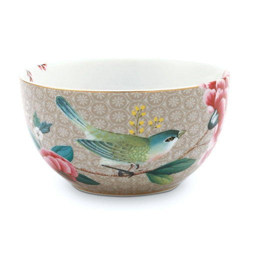 View full detailsThis khaki bowl is decorated all around with exotic flowers, a bird and golden details. The background has an elegant print. The large pink flower ...