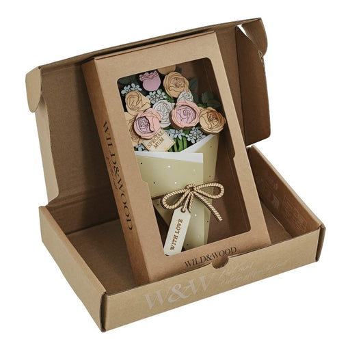The With Love 3D Flower Figurine Card transforms a simple greeting into a decorative keepsake. When opened, a wooden flower figurine stands upright...
