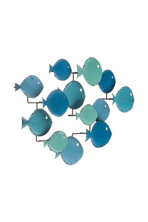 This metal wall art sculpture, shows a shoal of small fish swimming, their blue and green colouring really appearing to shimmer within the glaze. T...