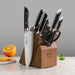 - Block: Solid acacia wood block with dedicated slots for knives, shears, and honing steel.