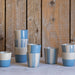 Design: Small ceramic beaker with a light blue glaze and refined finish