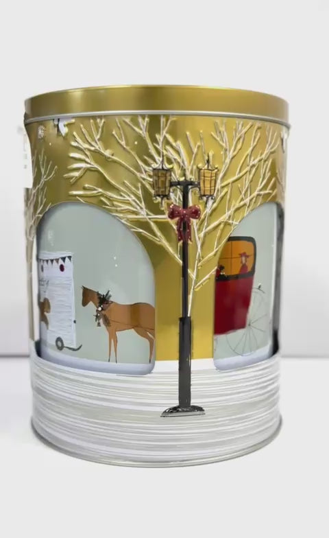 The unique feature of this tin is the rotating musical mechanism. Simply turn the key on the bottom of the tin to enjoy a charming "Let it Snow" rendition as the tin gently rotates.